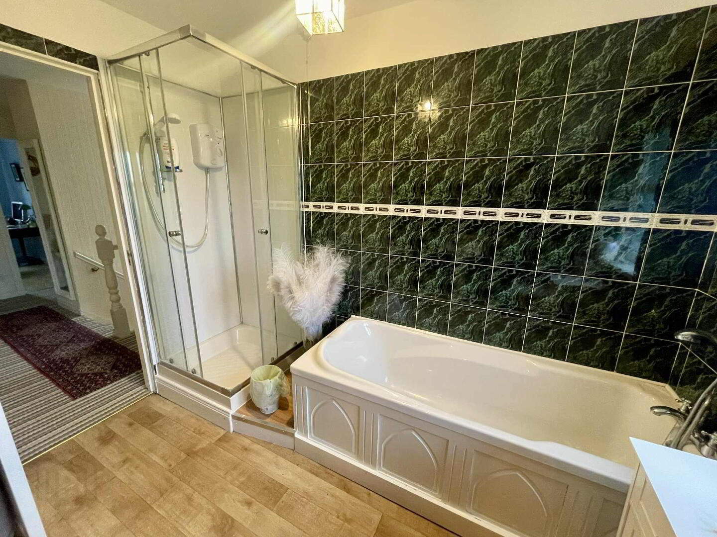 Vinyl wood effect flooring, tiled walls, bath, toilet, wash hand basin, enclosed shower cubicle with electric shower, ceiling light fitting.