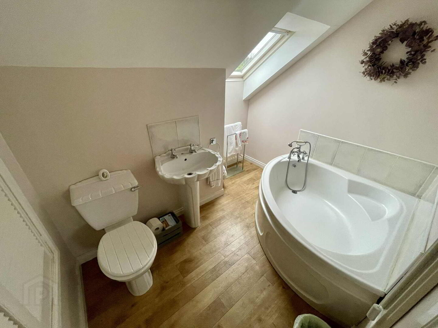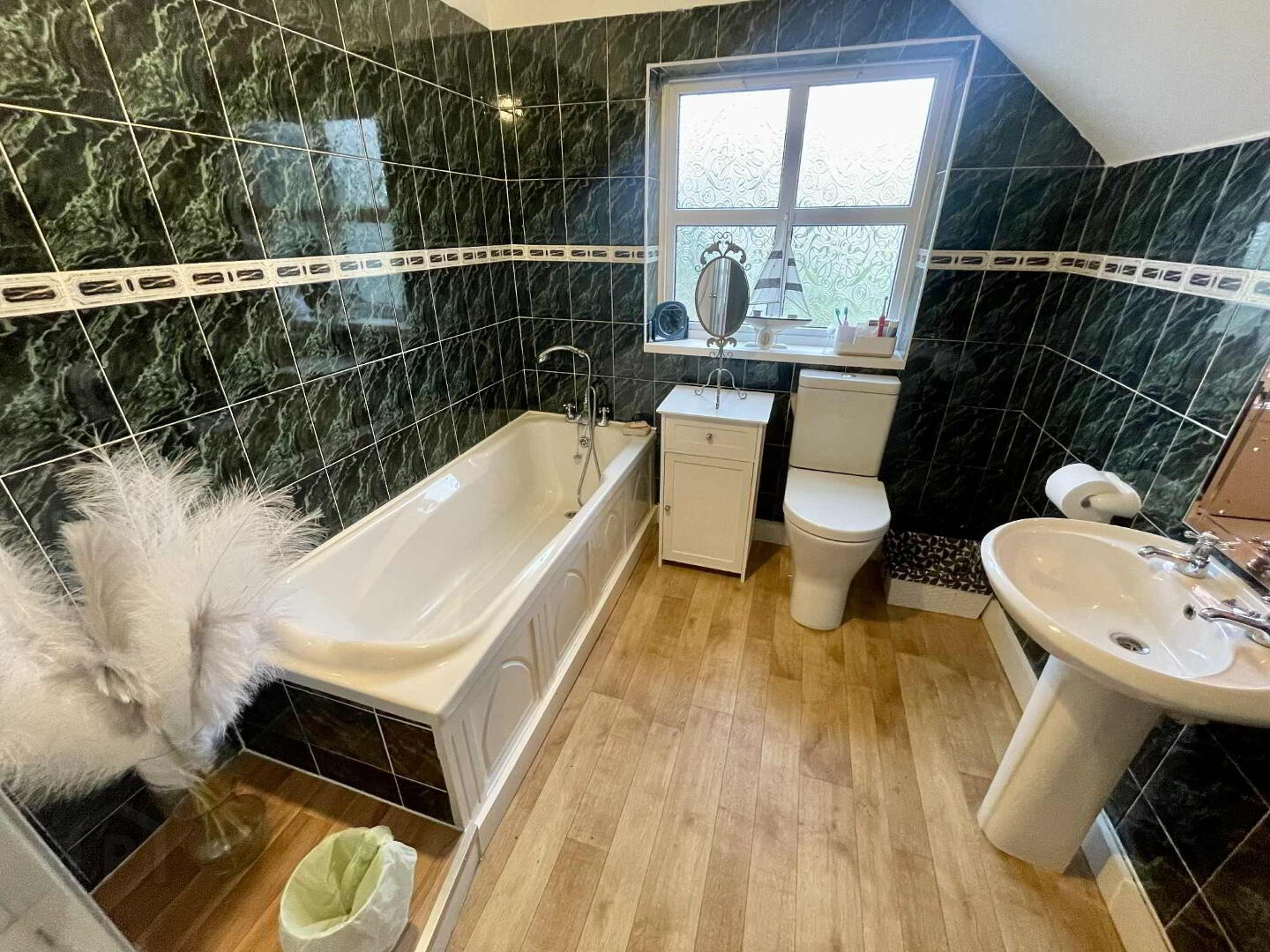 Vinyl wood effect flooring, corner bath with tiled splash back, toilet, wash hand basin, ceiling lgiht fitting.