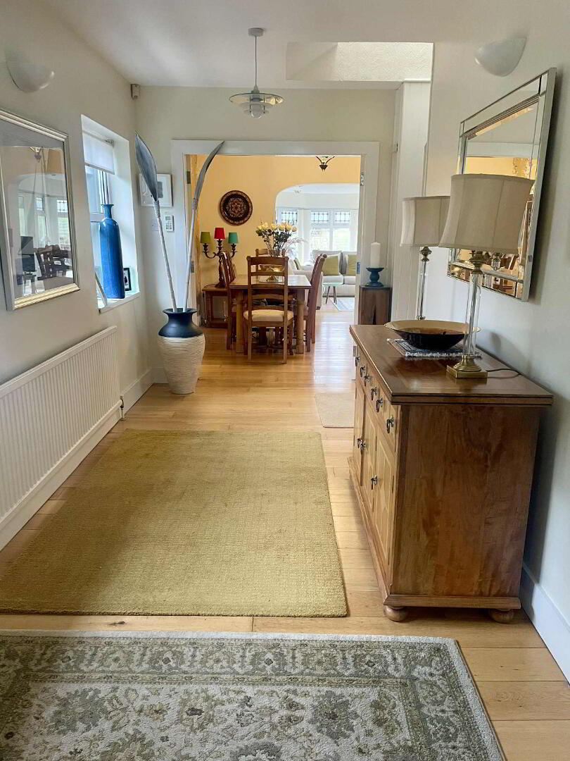 Pine floor, cast iron fireplace, marble hearth, surround and mantle, ceilng light fitting, power points, access to kitchen area and hallway.