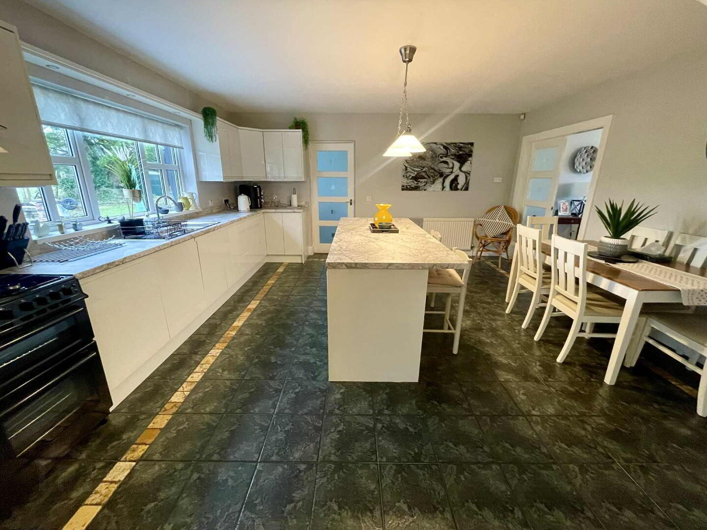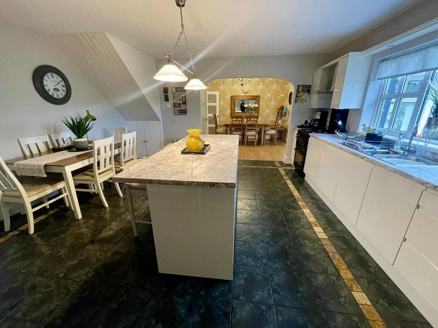 Tiled floor, high & low level kitchen units with worktop, stainless steel sink with left hand drainer, kitchen island, space for cooker, ceiling light fitting, power points, access to the utility room.
