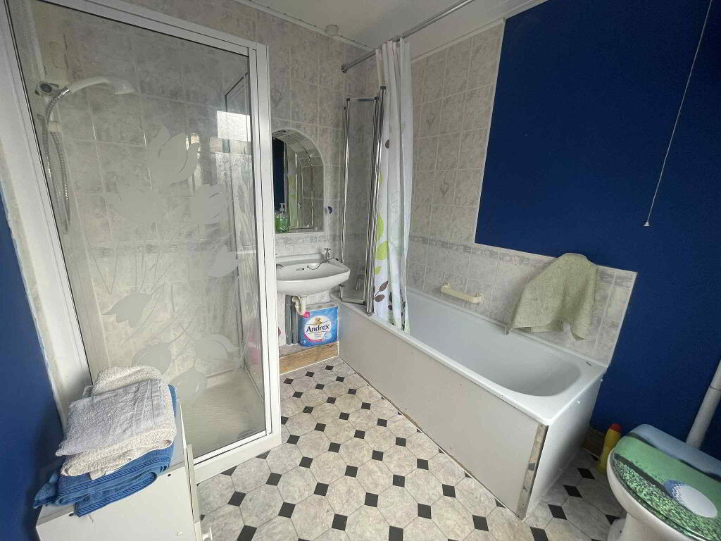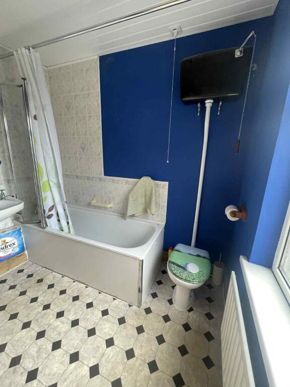 Vinyl flooring, partial tiled walls, bath with mixer taps, toilet, enclosed shower, sink