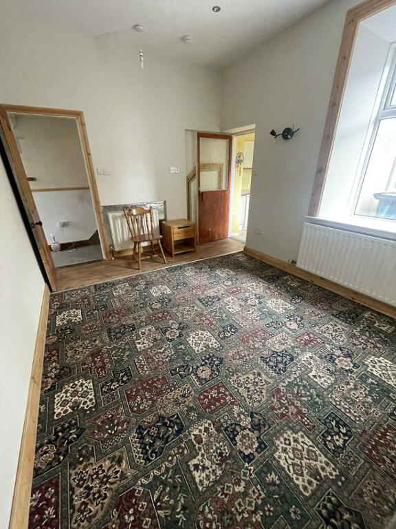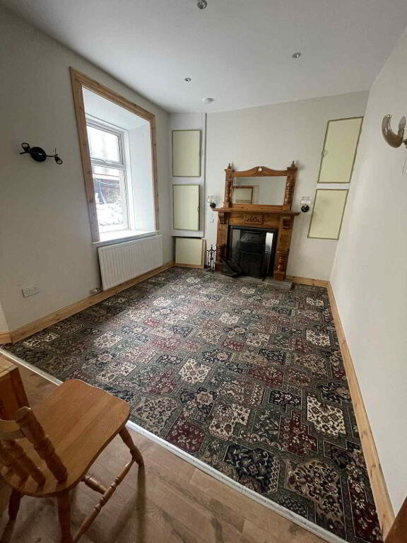 Carpet, open fireplace with back boiler, wooden surround, ceiling spotlights, radiator, power points.