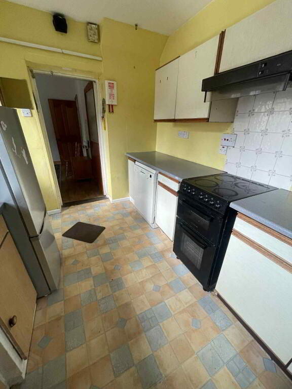 Vinyl floor, high & low level units with worktop, Nordmende cooker, extractor, stainless sink, heating controls, power points.
