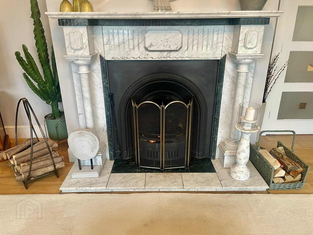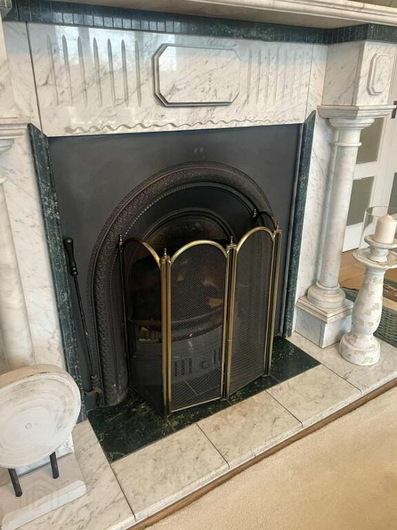Pine floor, cast iron fireplace, marble hearth, surround and mantle, ceilng light fitting, power points, access to kitchen area and hallway.