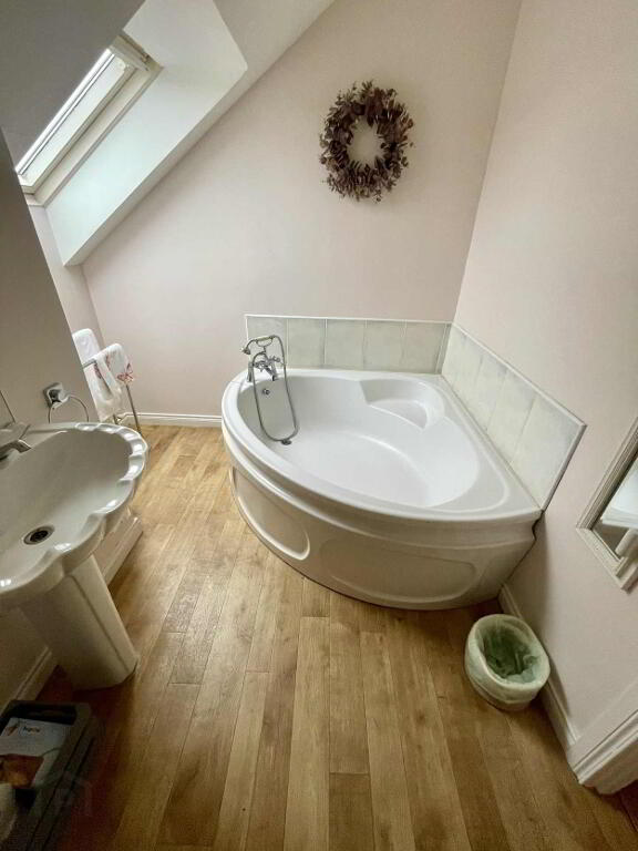 Vinyl wood effect flooring, corner bath with tiled splash back, toilet, wash hand basin, ceiling lgiht fitting.