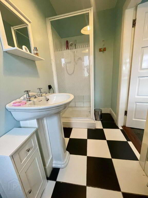 Tiled floor, toilet, wash hand basin, enclosed shower cubicle with electric shower, ceilng light fitting.