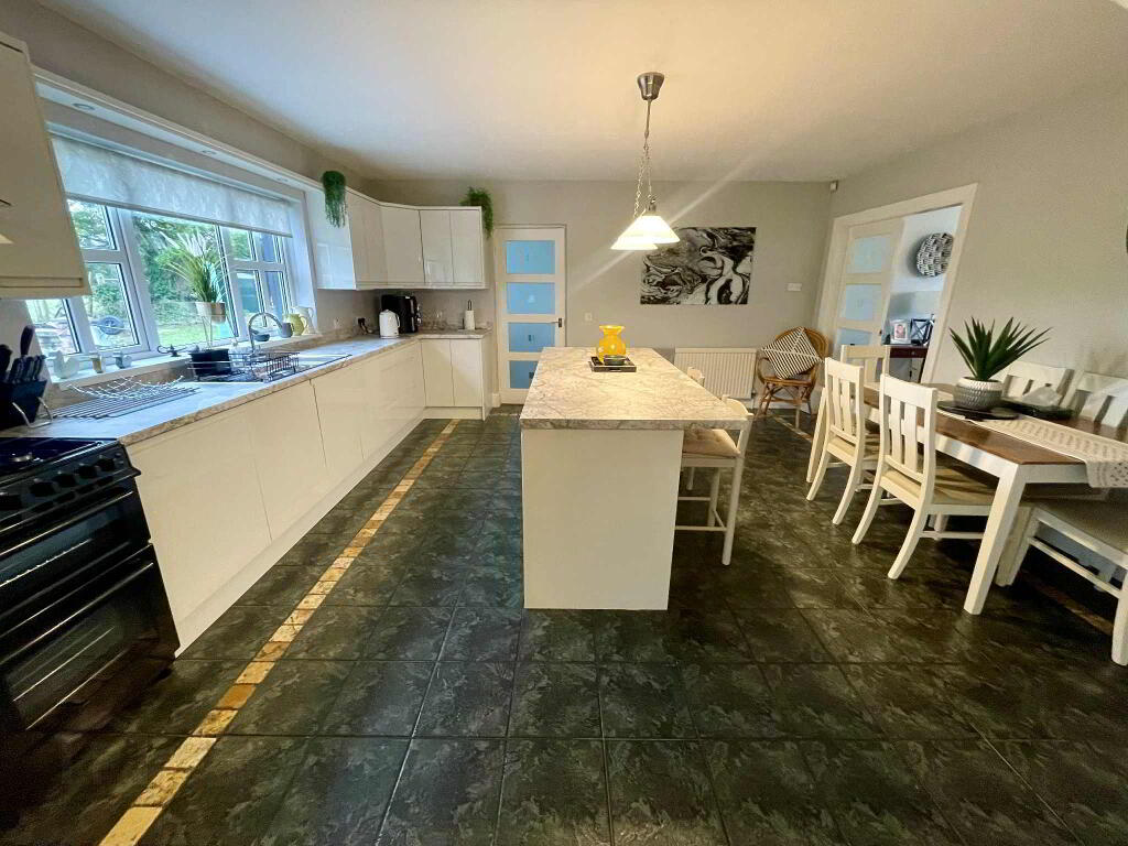 Tiled floor, high & low level kitchen units with worktop, stainless steel sink with left hand drainer, kitchen island, space for cooker, ceiling light fitting, power points, access to the utility room.