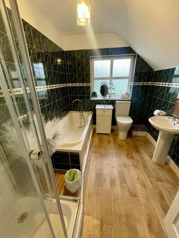 Vinyl wood effect flooring, tiled walls, bath, toilet, wash hand basin, enclosed shower cubicle with electric shower, ceiling light fitting.