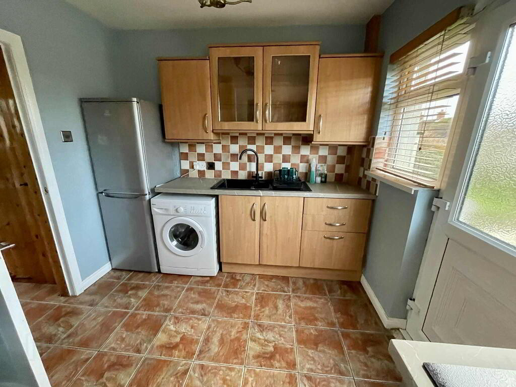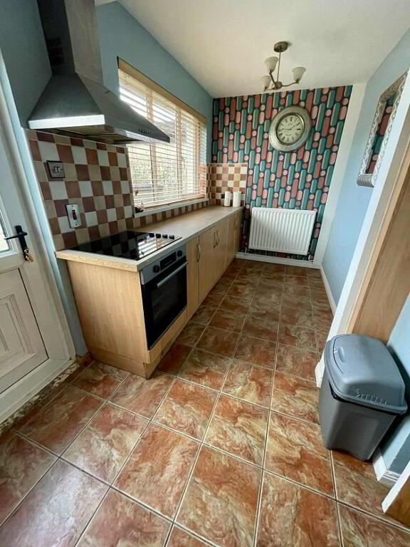 Tiled floor, high & low level units with worktop, sink with right hand drainer, heating controls, Logic ceramic hob, Beko oven, Beko washing machine, space for fridge freezer, ceiling light fitting.
