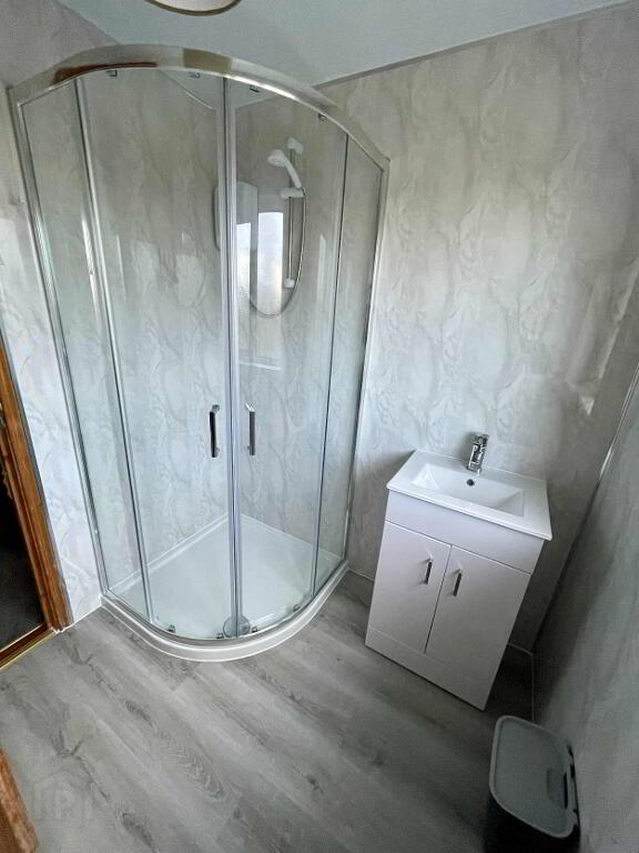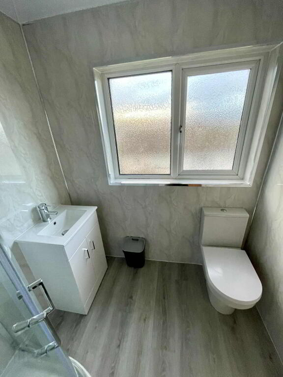 Vinyl floor, toilet, sink with vanity unit, enclosed shower cubicle with Triton electric shower, PVC panelled walls, ceiling light fitting.