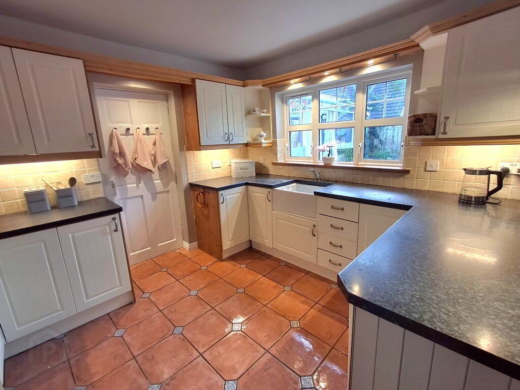 Tiled floor, high & low level units with worktop, Belfast sink, Belling range cooker with tiled splash back, dishwasher, heating controls, ceiling light fitting, power points.