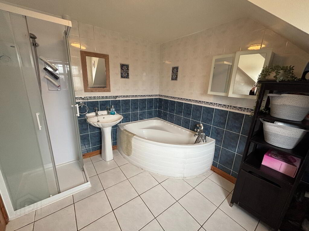 Tiled floor & walls, toilet, sink, corner bath, enclosed shower cubicle with Creda electric shower, towel radiator.
