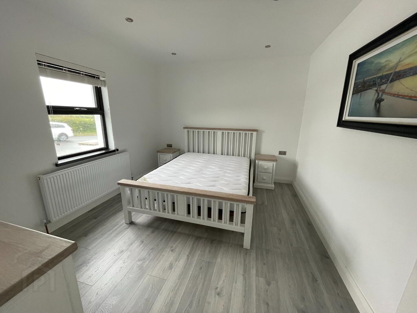 Another generously sized bedroom with modern finishes, laminate floor, spotlights, radiator, power points, and vertical blinds.