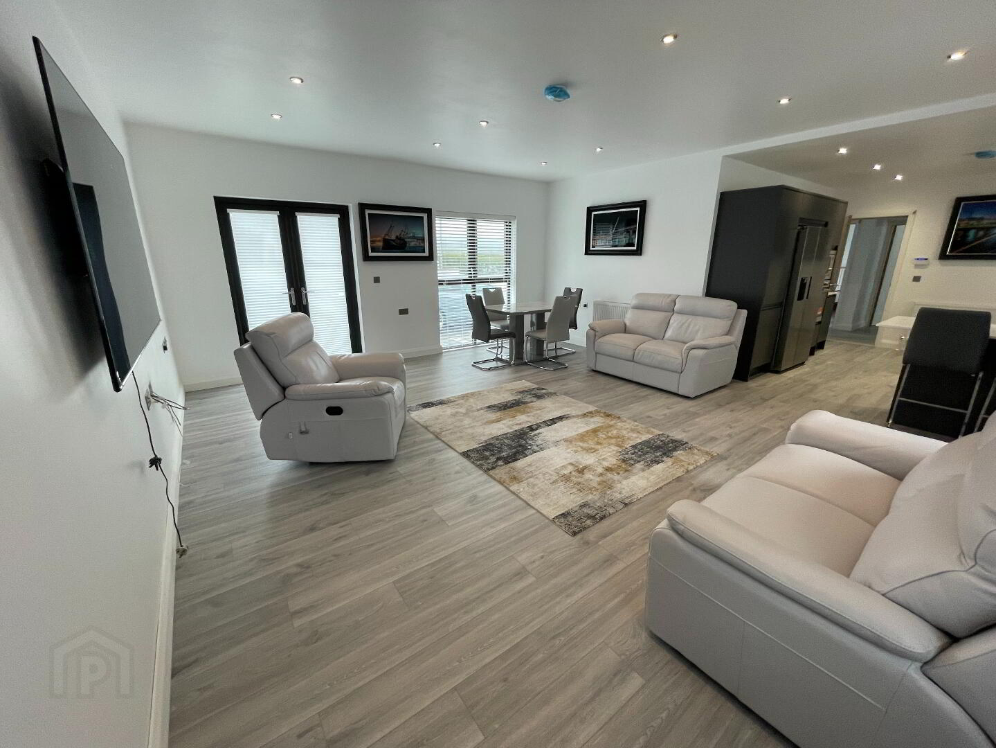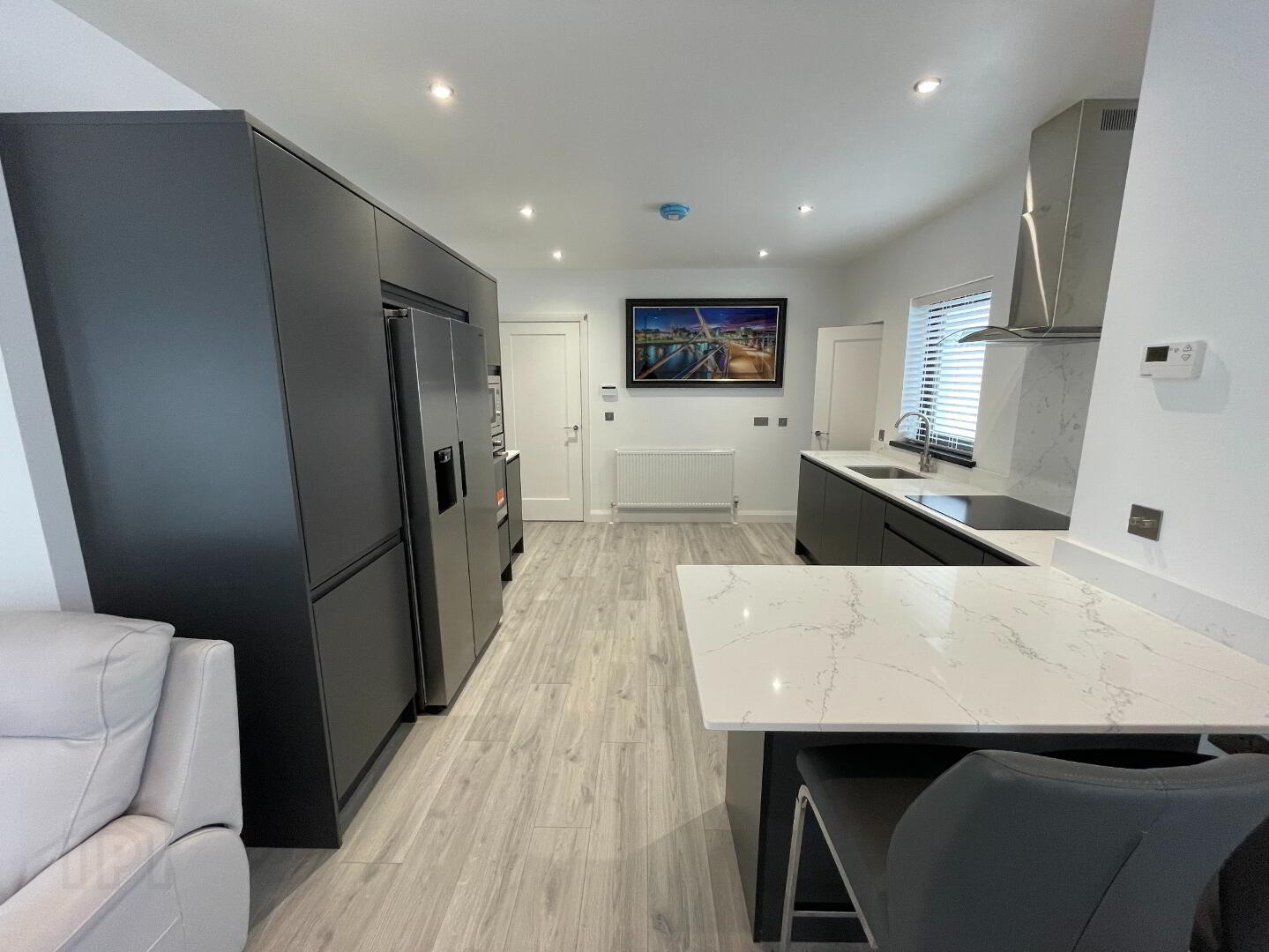 A superb open-concept heart of the home featuring laminate flooring, spotlights, radiator, power points, heating controls, and a modern Tag alarm system.